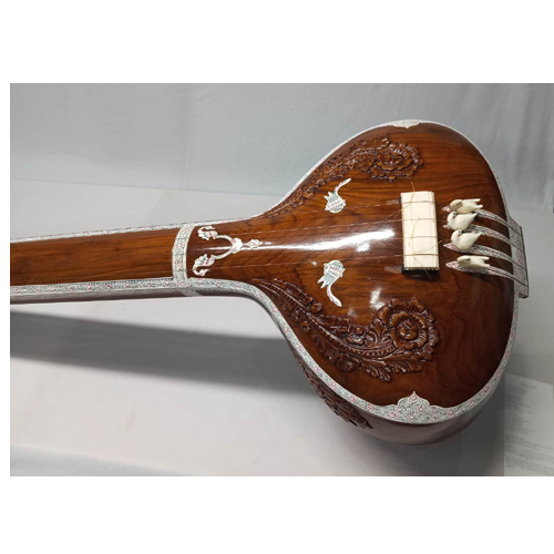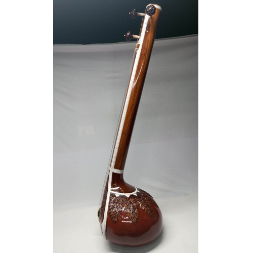The tanpura (or tambura, tanpuri) is a long-necked plucked string instrument found in various forms in Indian music; it does not play melody but rather supports and sustains the melody of another instrument or singer by providing a continuous harmonic bourdon or drone. A tanpura is not played in rhythm with the soloist or percusionist: as the precise timing of plucking a cycle of four strings in a continuous loop is a determinant factor in the resultant sound, it is played unchangingly during the complete performance. The repeated cycle of plucking all strings creates the sonic canvas on which the melody of the raga is drawn. The combined sound of all strings is very rich in harmonics that will enhance the resonance of the tones sung or played to the accompaniment of a fine tanpura.